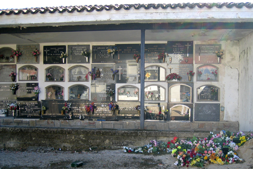It seems a crying shame that the cemeteries should be so ‘built up’ and urban alongside such beautiful countryside. The one in the photos is the local cemetery. It’s tucked behind a gas station and a colourless hostal and bar when all around we have pine woods and olive groves. I don’t expect to find green lawns and neat flower beds here in Spain, but it surely would be possible to have something a little less drab.
