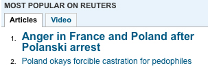 I don’t want to get involved with the rights and wrongs of the original 1977 Polanski case, nor even with the current extradition issue, but there is something disturbing about this juxtaposition of headlines from Reuters yesterday: