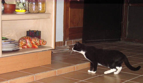 Almost the first thing he saw when he came in was the tiger statue. He then spent over twenty minutes stalking, reversing and approaching with caution from different angles, before deciding that he’d really rather go back into the cold and dark of the garden than spend time in the same place as that fearsome creature.