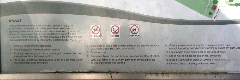 In the park in Leamington, we read this notice laying out the bylaws: