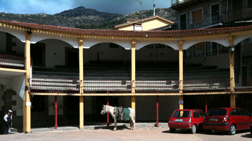 Last weekend I visited Pedro Bernardo, an almost vertical village in the Gredos foothills, just 80 miles from Madrid and with a population of about 1200. As can be seen from the photo, there’s plenty of room to park your pony in the bull ring, and it doesn’t seem to matter much if you leave it taking up two spaces.