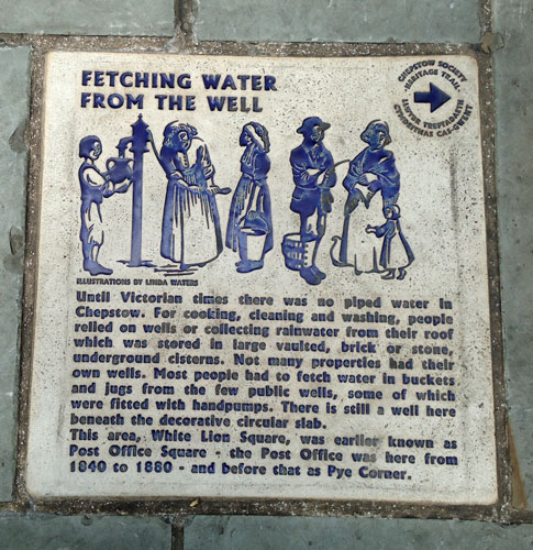 I was back in Chepstow recently, and saw the tile above, which I didn’t remember having seen before. The title is Fetching water from the well and, rather aptly, the illustration is by Linda Waters. Clicking on the photo should enlarge it enough to show the text, so I won’t write it all out here.