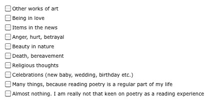 I think I plumped for the penultimate suggestion: “Many things, because reading poetry is a regular part of my life” although I felt guilty about the answer as I know I don’t read half as much poetry as I should.