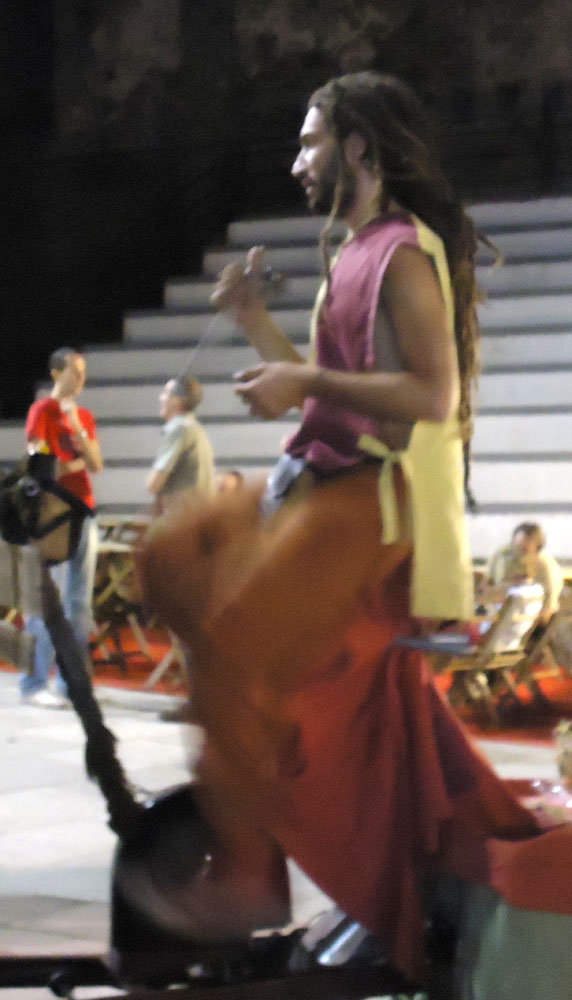 Actually, at least one of the attractions of the fair is quite twenty-first century, with the whole ‘go-green’, resource-saving attitude. It’s true that when the feria comes to town for the fiestas del pueblo they sometimes bring a carousel which requires no motor as it’s simply shetland ponies walking patiently in a circle. But I’d never seen a carousel powered by a person until last night: