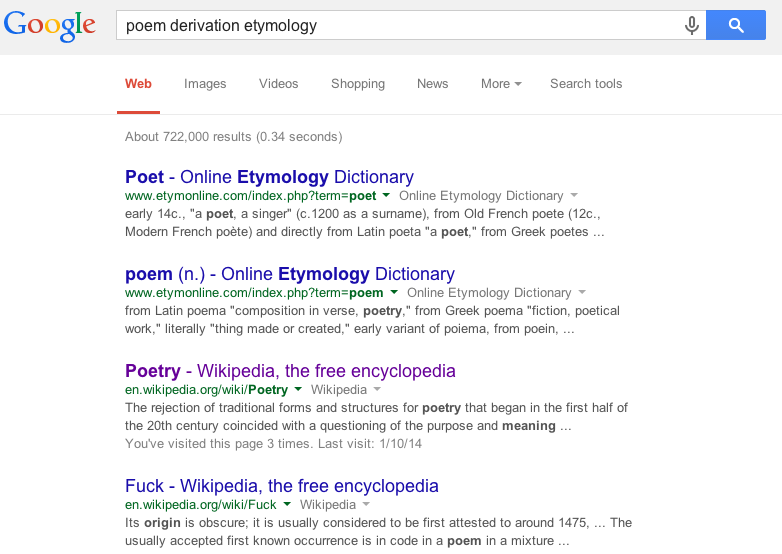 This morning, I wanted to make a pun on the idea of a poet as a “maker” and a poem as “a made thing”; before I did so, though, I went to Google to check that I had the etymology right. What I found reminded me of those IQ test questions where you fill in the next word in a set or in a sequence.