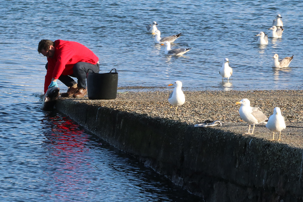 It became clear that he was cleaning a large fish of some sort – quite possibly a conger eel. He gutted it and cut off its fins, then washed it thoroughly in the sea before putting it into the bucket and leaving the gulls to make do with diving for the trimmings.