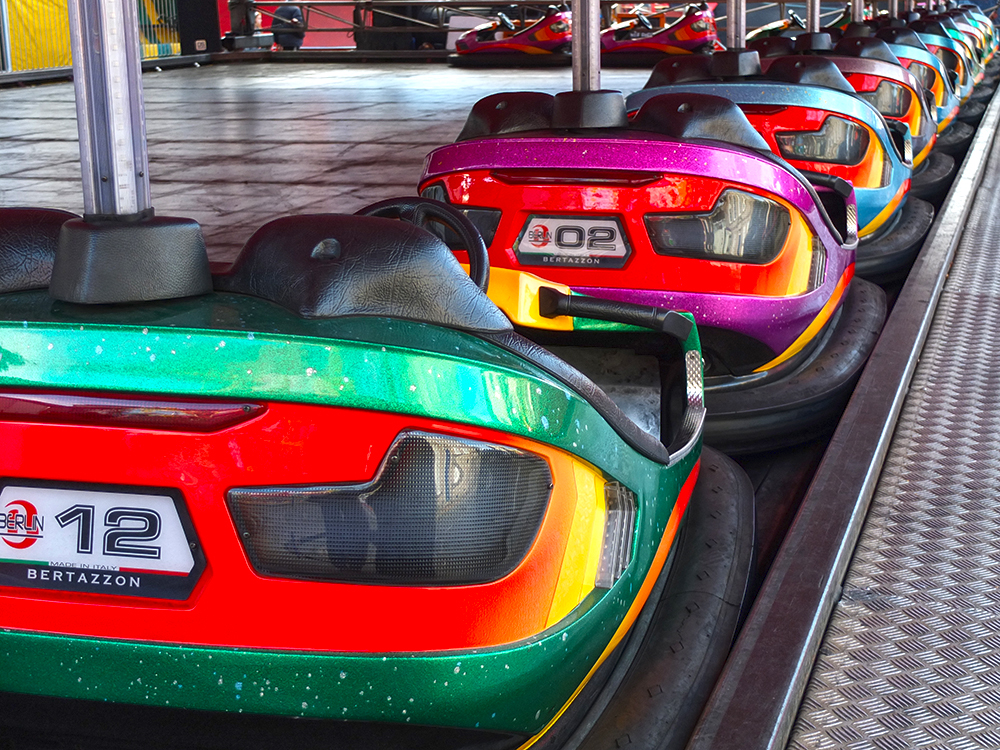 But that was in Spain, where the heat and dazzle of the sun drain the bright neon from the rides and leave drab pastels instead.