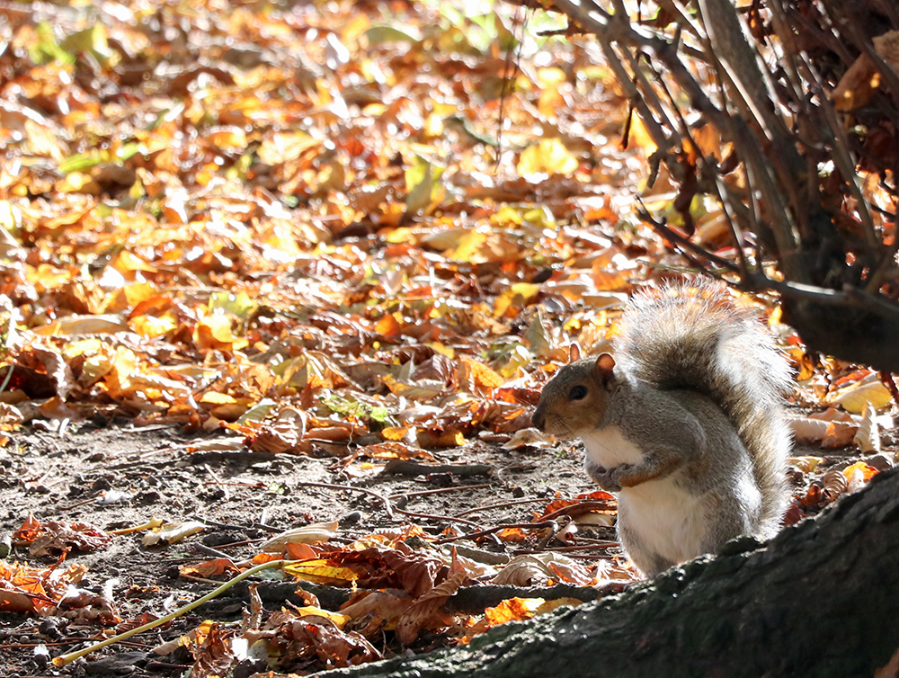 Sunlight shines through a squirrel’s ears, turning them the colour of autumn leaves.