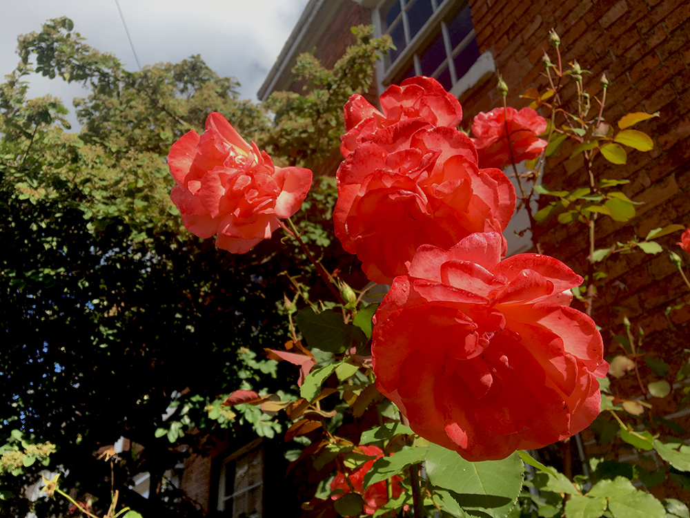 The roses in the neighbour’s garden are bright despite the weather, which has not been kind to them this summer. There’s been far too much rain and wind after the recent short but intense heatwave.