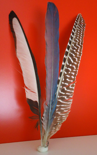 I think the black and white one came from a woodpecker, and, as far as I know, was shed naturally. The blue one is from a rabilargo, whose wing was left on my doorstep, presumably as a comment on the inadequacy of a kibble diet for outdoor cats. And the rather fine spotted quill is one I picked up from a pile of feathers in the olive grove next door. Whether the cats worked as a team to bring down one of the neighbour’s guinea fowls, I don’t know, but I’d have thought it would have been too big a job for one on their own.